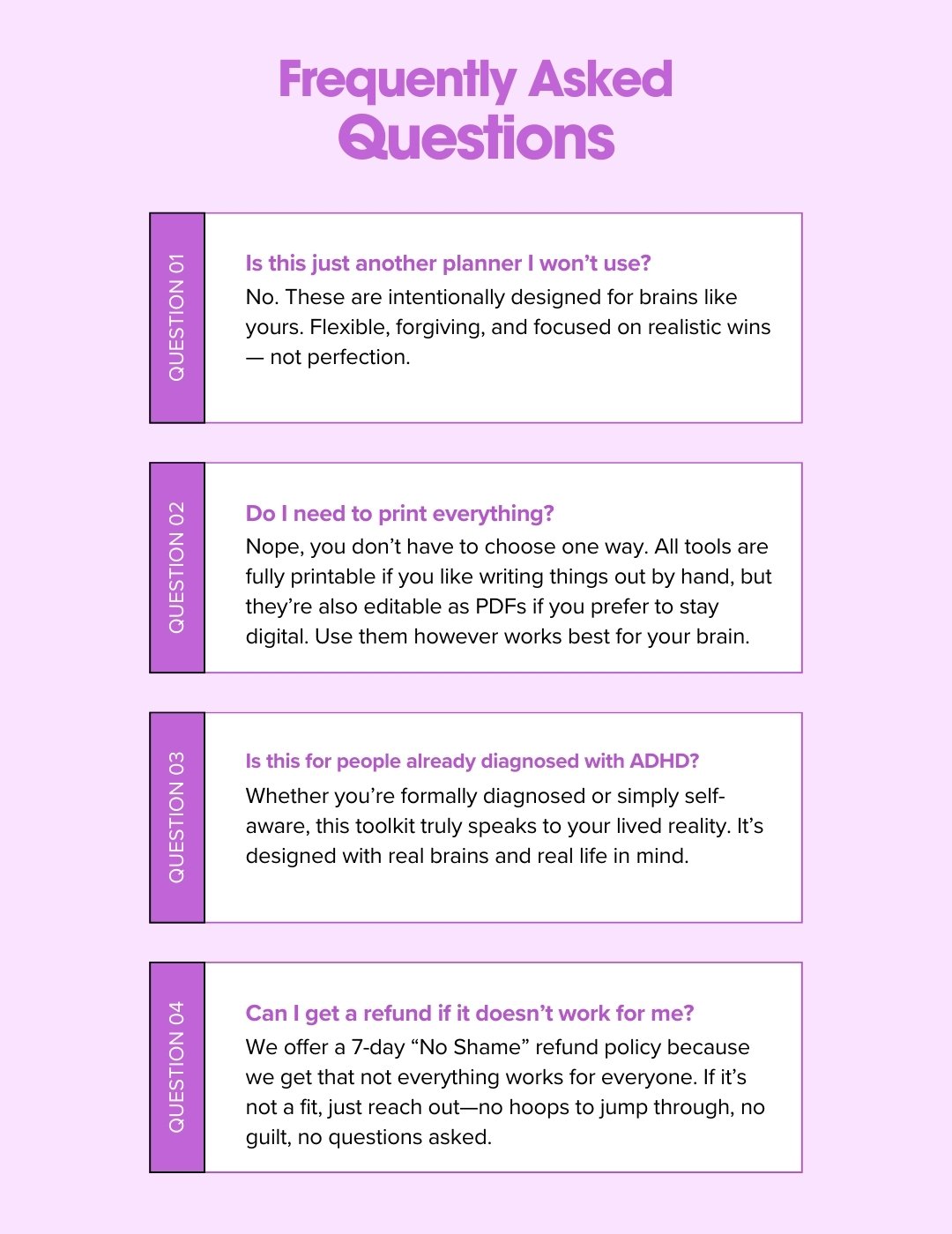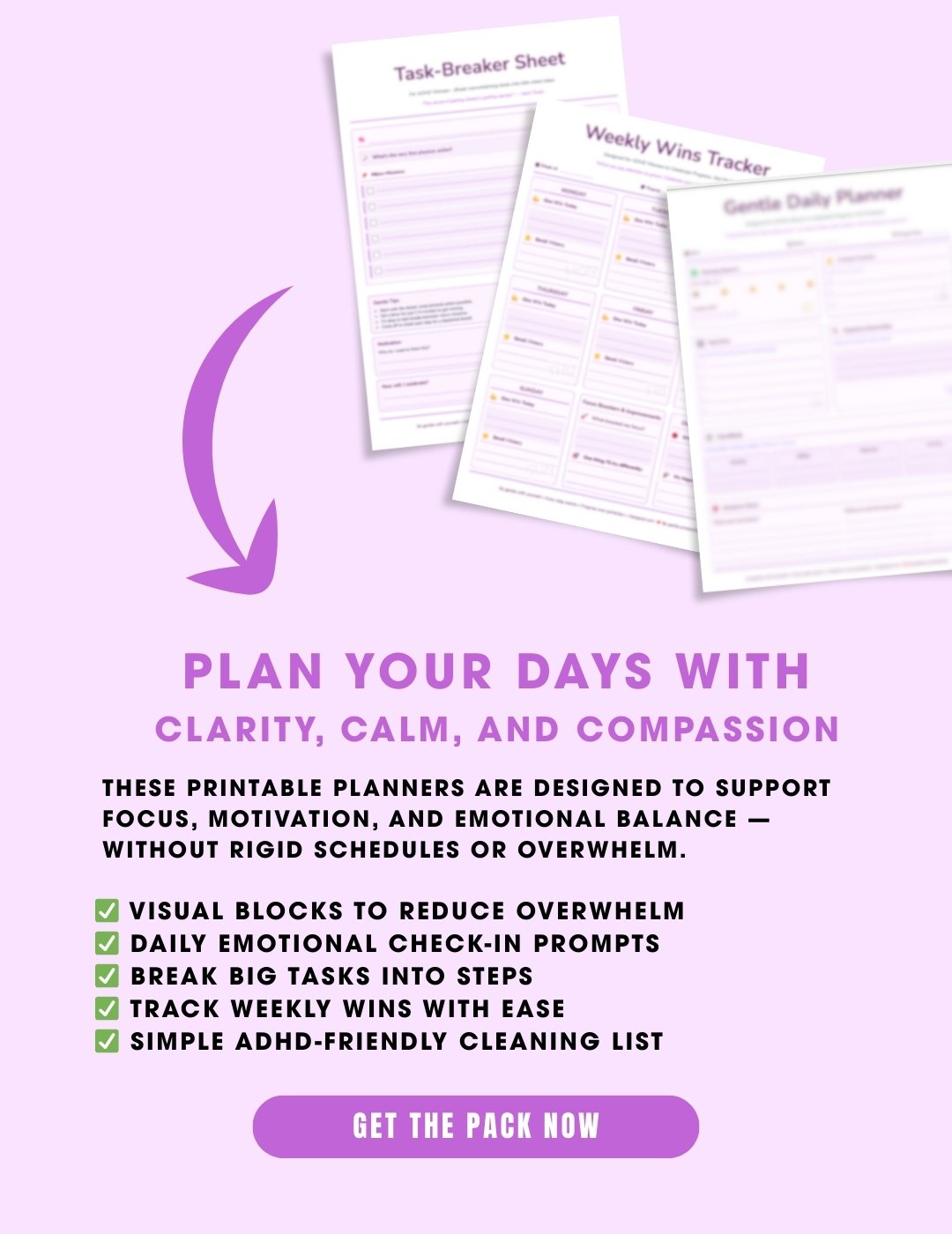 You’ll get a booklet, printable planners, task-breaker sheets, an executive dysfunction kit, a cleaning checklist, and a motivational poster—all designed for ADHD-friendly productivity.